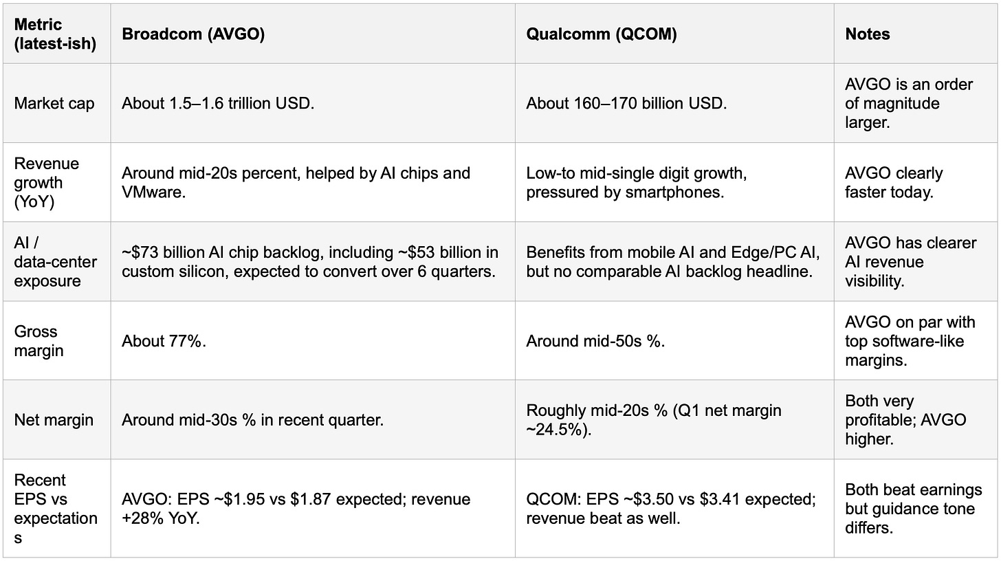 Takeaway: AVGO currently looks like the higher‑growth, higher‑margin compounder, while QCOM is profitable but growing more slowly as it works through smartphone and client concentration issues.