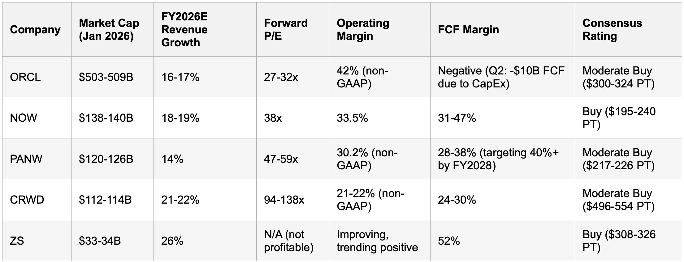 Valuation dispersion is striking: Oracle commands the lowest forward P/E at 27x despite 16-17% revenue growth guidance, ServiceNow trades at 38x supporting 18-19% growth, while cybersecurity multiples range from PANW’s 47x (14% growth) to CRWD’s 94-138x (21-22% growth) and ZS’s negative earnings but 52% free cash flow margin. This pricing reflects divergent market expectations around margin expansion, capital efficiency, and TAM penetration rates.